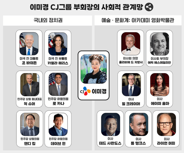 최근 'K-콘텐츠' 산업에 대한 국제적인 관심에 힘입어 이미경 CJ그룹 부회장의 글로벌 네트워크에도 새삼 관심이 모아지고 있다. 이 부회장은 CJ그룹의 문화·콘텐츠 산업을 주도하는 과정에서 세계 각국의 문화·예술계는 물론 정치권 인사들과도 인연을 쌓아온 것으로 나타났다. 다양한 분야의 지원이 필수로 요구되는 문화·콘텐츠 산업의 특성이 반영된 결과로 분석된다. 다만 이 부회장이 오랜 기간 공들여 구축해 온 글로벌 네트워크는 현재 미국 권력을 쥐고 있는 도널드 트럼프 대통령과 공화당에 반(反)하는 측면이 많다는 점에서 CJ그룹의 미국 사업 확장에는 부정적 요인이 될 수도 있다는 평가도 나온다.