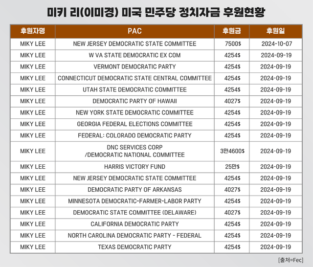 심지어 이 부회장은 지난 2024년 9월 19일 하루 동안 펜실베이니아, 애리조나, 조지아 등 대선의 승부를 결정지었던 핵심 경합주를 포함해 미 전역 30여개 이상의 주 단위 민주당 위원회에 동시다발적으로 후원을 진행하기도 했다. 지역별 후원 규모는 ▲뉴욕·캘리포니아·펜실베니아·애리조나·조지아 4254달러(약 635만원) ▲아칸소·델라웨어 4027달러(약 600만원) 등이었다. 각 주의 민주당 위원회는 현장 투표 독려와 여론 형성을 담당하는 실무 조직이다.