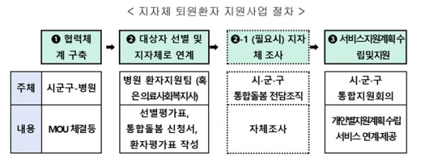 퇴원환자 지역사회 연계 지원사업은 각 시군구와 협약을 맺은 병원(이하 협약병원)이 퇴원(예정) 환자 중에 돌봄이 필요한 대상자를 선별 후 환자평가를 실시, 지자체에 의뢰하면 지자체는 병원의 조사결과를 바탕으로 통합지원회의를 열어 개인별 지원계획을 수립하고 방문진료 가사 지원 등 필요한 돌봄서비스를 신속하게 연계하는 체계이다.