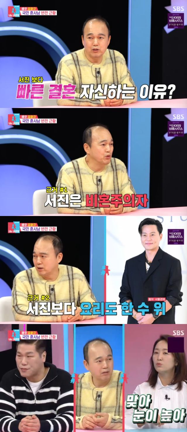 이날 김구라는 김광규의 등장에 또 다른 싱글 이서진을 언급하면서 "같은 싱글이라도 느낌은 많이 다른데, 이서진보다는 결혼을 빨리 할거라고 호언장담을 했다더라"고 의아해했다.