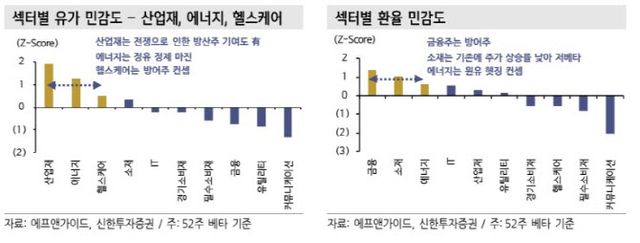 유가와 환율은 지정학 리스크 국면에서 가장 빠르게 반응하는 매크로 변수로 꼽힌다. 최근 중동 이슈 역시 유가 상승과 원화 약세라는 형태로 시장에 반영됐다는 설명이다. 실제 신한투자증권이 최근 52주 기준 섹터별 민감도를 점검한 결과, 유가 민감도는 산업재와 에너지 업종의 반응이 상대적으로 높게 나타났다.