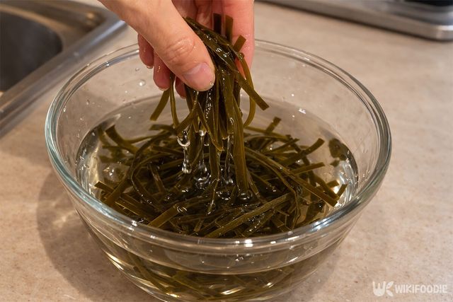 채 썬 다시마는 미지근한 물에 10분 정도 담가둔다. 물에 담가두면 딱딱했던 다시마가 부드러워지며 알긴산 성분이 배어 나와 밥을 더 찰지게 만든다.