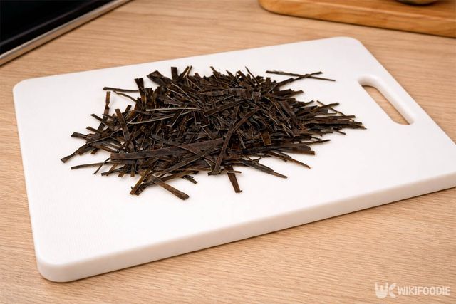 건다시마는 가위를 사용해 가늘게 채를 썬다. 가느다란 채 형태는 밥과 어우러졌을 때 입안에서 겉돌지 않고 부드러운 식감을 만든다.