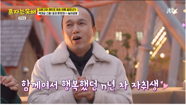 10일 밤 8시 50분 방송된 JTBC ‘혼자는 못 해’에서는 게스트 김광규가 전현무, 추성훈, 이수지, 이세희와 함께 부산으로 떠나 레트로 청춘 여행을 즐기는 모습이 그려졌다.