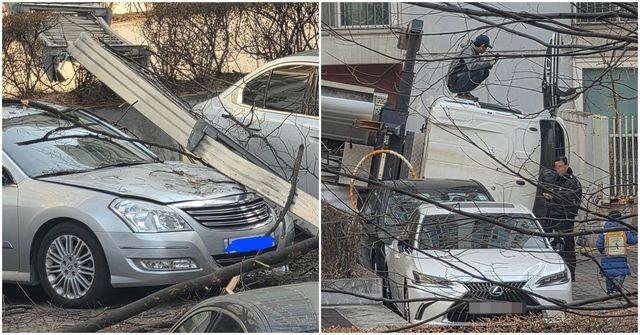 일부 차량은 지붕과 보닛이 찌그러진 상태였고,나무도 함께 쓰러져 차량 위에 얹혔다. 렉서스, BMW 등 고급 차종을 포함해 다수의 차가 피해를 입은 것으로 보인다.
