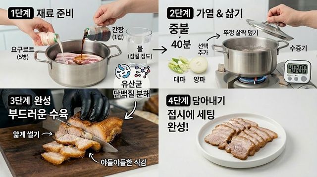 [인포그래픽] 기사를 바탕으로 AI가 생성한 요구르트 수육 조리 과정 인포그래픽 이미지.