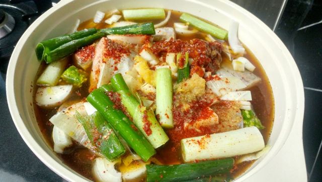 양념을 푼 국물이 다시 끓어오르면 불을 중간 불로 낮춘다. 청양고추를 먼저 넣고 무와 동태가 충분히 익을 때까지 끓인다. 무가 투명하게 익고 동태 살이 단단해지면 콩나물과 대파, 두부를 얹는다.