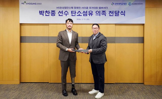 조현상 HS효성 부회장은 이날 직접 박찬종 선수에게 탄소섬유 의족을 전달하며, “‘내 다리는 한계가 없다’는 박 선수의 모토는 불가능에 도전하여 가치를 만들어내는 HS효성의 철학과도 닮아 있다”며 “고부가 소재 개발에 불가능은 없다는 정신으로 만들어 낸 HS효성의 탄소섬유가 장애인 사이클 국가대표 박찬종 선수의 도전을 든든히 뒷받침해, 여러 국제 무대에서 대한민국을 빛내는 데 도움이 되길 기대한다”며 “HS효성첨단소재는 앞으로도 국가·국민·인류의 삶을 건강하고 풍요롭게 만드는 가치경영을 실천해 나가겠다”고 말했다.