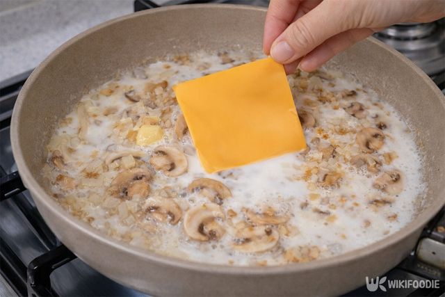 5. 우유 200ml와 물 2큰술을 붓고 끓어오르면 체다 치즈 1장을 넣어 녹인다.