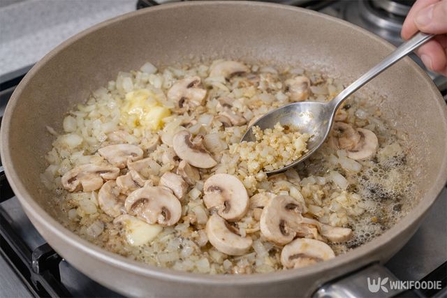 4. 양파가 투명해지면 양송이버섯을 넣고 수분이 나올 때까지 함께 볶는다.