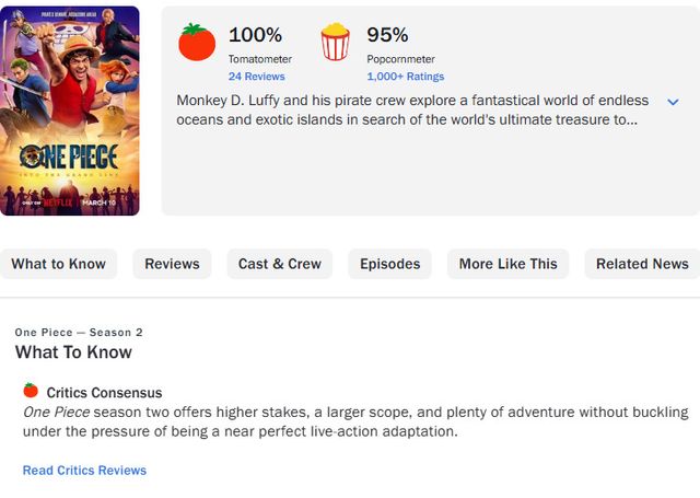 OTT 순위 집계 플랫폼 플릭스패트롤에 따르면 지난 10일 8부작 전편이 공개된 넷플릭스 시리즈 '원피스' 시즌2는 하루 만인 11일, 전 세계 43개국에서 TV 시리즈 시청 1위, 20개국에서 2위를 기록했다.