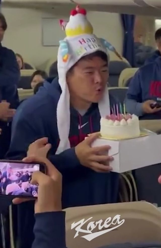 2026 WBC(월드베이스볼클래식) 8강에 진출한 한국 야구대표팀의 '맏형' 노경은(42·SSG 랜더스)이 의미 있는 생일을 맞았다. 그는 전세기에 탑승하기 전 "미국으로 가는 비행기 상공에서 생일을 보내게 됐는데 너무 뜻깊은 생일이 될 것 같다"고 인터뷰한 바 있다. 후배들의 진심 어린 축하에 노경은의 어깨도 으쓱했다.