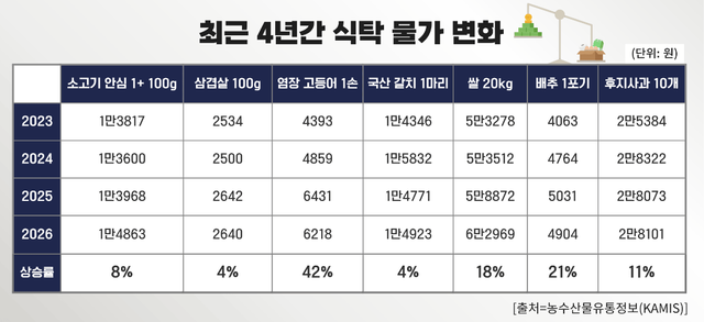 고물가로 식자재 가격이 전반적으로 오르면서 소비자들의 식비 부담도 계속 커지고 있는 것으로 나타났다. 농수산물유통정보(KAMIS)에 따르면 최근 4년간 주요 식탁 물가는 전반적으로 상승세를 보였다. 소고기 안심(1+·100g)은 2023년 1만3817원에서 2026년 1만4863원으로 약 8% 상승했고 삼겹살(100g) 가격 역시 같은 기간 2534원에서 2640원으로 약 4% 올랐다.