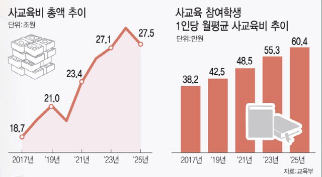 12일 교육부와 국가데이터처가 발표한 ‘2025년 초중고 사교육비 조사 결과’에 따르면 지난해 전체 학생들의 사교육비 총액은 27조 5000억원으로 전년(29조2000억) 대비 5.7%(1조 7000억원) 줄었다. 2020년 코로나 팬데믹 이후 4년 연속 증가하던 흐름이 작년 조사에선 주춤해졌지만 이를 추세 전환으로 볼 수 있을지는 아직 미지수라는 분석도 나온다.