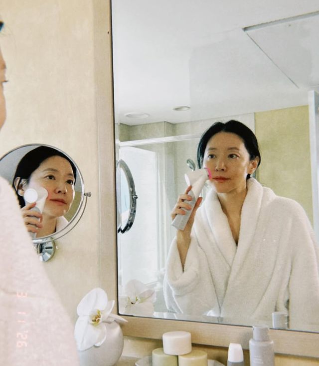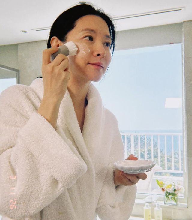 세안 후 뷰티 기기를 활용해 피부를 관리하는 모습도 눈길을 끈다. 화장기 없는 민낯임에도 불구하고 잡티 하나 없는 투명한 피부와 맑은 안색은 ‘방부제 미모’의 대명사다운 위엄을 보여준다.