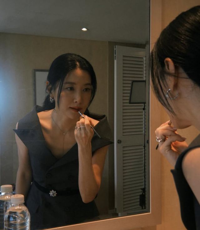 일상적인 모습 뒤에 이어지는 반전 매력도 압권이다. 이영애는 짙은 그레이 톤의 세련된 오프숄더 드레스를 입고 화려한 귀걸이와 메이크업으로 단장하며 완벽한 ‘시상식 비주얼’로 변신했다. 거울을 보며 립 메이크업을 수정하거나 복도를 걷는 뒷모습에서는 이영애 특유의 고혹적이고 우아한 분위기가 물씬 풍긴다.