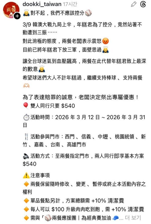 ‘540’은 지난 8일 WBC 조별리그에서 대만이 한국을 5대4로 꺾은 점수를 연상시키는 숫자로, 두끼 대만 법인은 이를 활용해 “두 사람이 함께 방문하면 540 대만달러(약 2만 5000원)에 식사할 수 있다”라는 할인 이벤트를 홍보했다.
