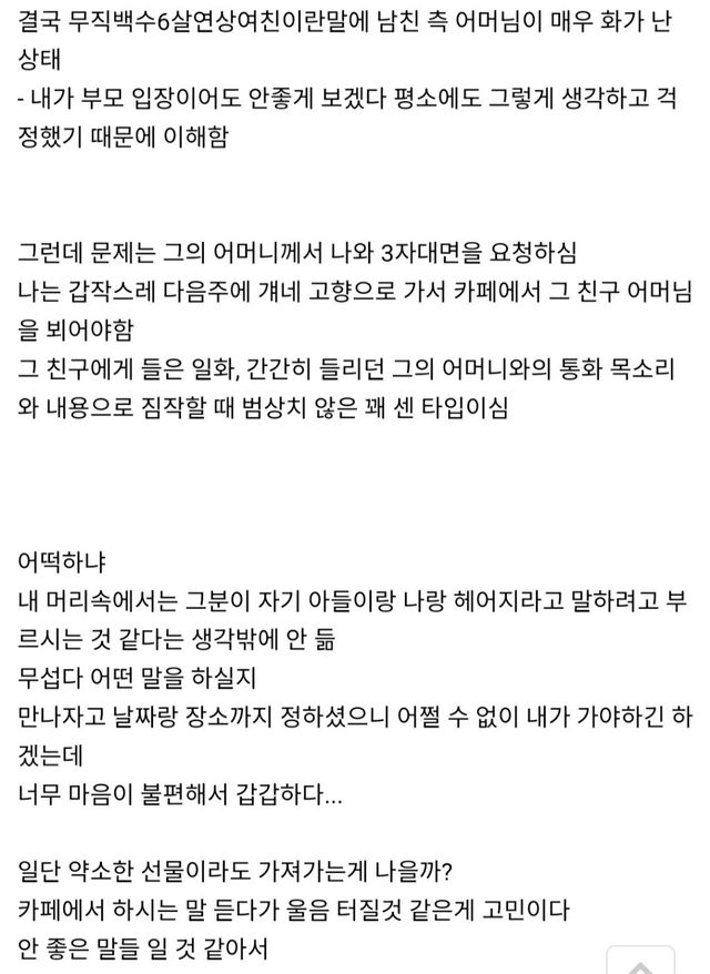 남친의 어머니는 다음 주 고향 카페에서의 삼자대면을 강력히 요청했고, A씨는 거절할 수 없는 상황에서 극심한 스트레스를 호소하고 있습니다.