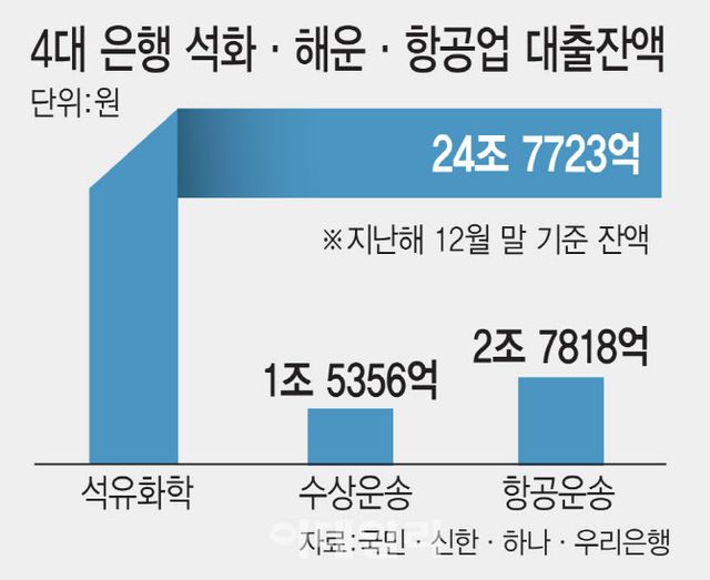 12일 금융권에 따르면 4대 은행(KB국민·신한·하나·우리)의 지난해 말 기준 석유화학·해운·항공업종 기업 대출잔액은 29조 897억원으로 집계됐다. 은행뿐 아니라 저축은행, 상호금융 등 예금취급기관까지 범위를 넓혀보면 해운 및 항공업, 물류업을 포괄하는 운수·창고업 대출잔액은 46조 2068억원, 석유·화학 제조기업 대출잔액은 67조 3865억원으로 총 113조 5933억원에 달한다.