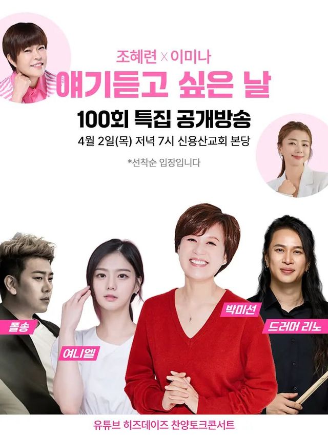 12일 유튜브 채널 '히즈데이즈' 측은 조혜련, 이미나의 '얘기듣고 싶은 날'이 방송 100회를 맞아 공개 방송을 진행한다고 공지했다.