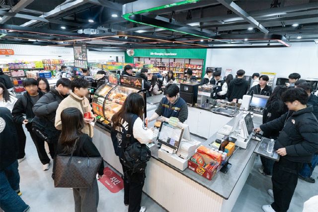 매장 전면에는 스퀘어형 카운터를 배치해 치킨, 즉석피자, 군고구마, 구슬아이스크림 등을 판매하는 ‘푸드스테이션’을 운영한다. 대학 상권 특성을 고려해 라면 매대도 일반 점포보다 약 3배 확대했고 셀프 라면 조리기도 설치했다. 해외 인기 상품과 PB상품을 모은 ‘세븐셀렉트존’과 뷰티 상품 코너도 함께 구성했다.