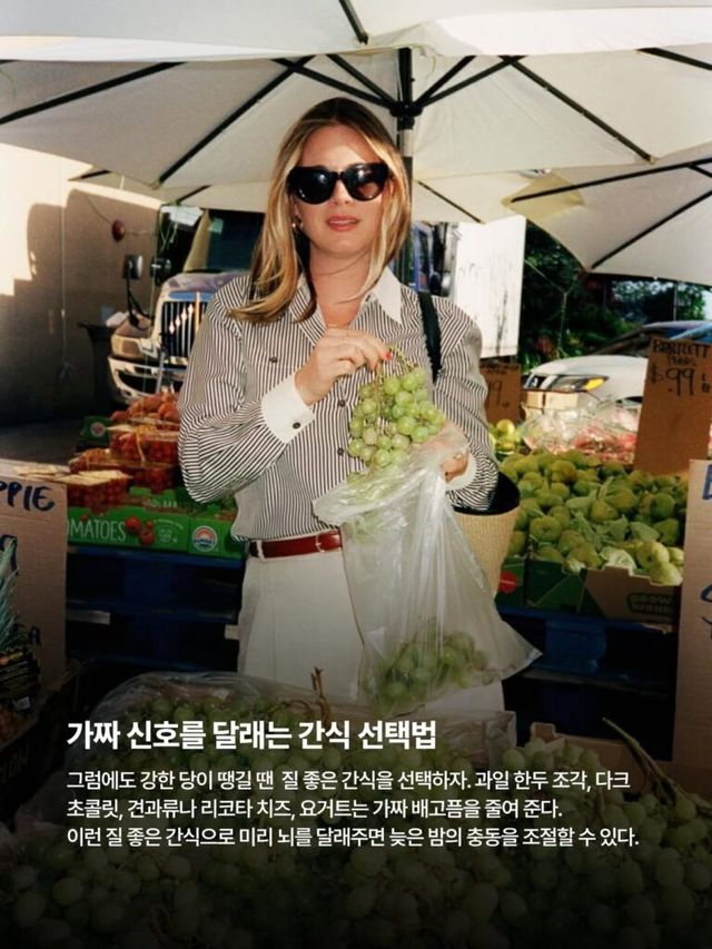 그럼에도 강한 당이 땡길 땐 질 좋은 간식을 선택하자. 과일 한두 조각, 다크 초콜릿, 견과류나 리코타 치즈, 요거트는 가짜 배고픔을 줄여 준다. 이런 질 좋은 간식으로 미리 뇌를 달래주면 늦은 밤의 충동을 조절할 수 있다.