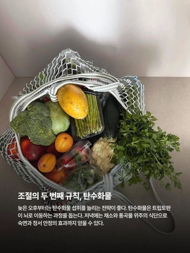 늦은 오후부터는 탄수화물 섭취를 늘리는 전략이 좋다. 탄수화물은 트립토판이 뇌로 이동하는 과정을 돕는다. 저녁에는 채소와 통곡물 위주의 식단으로 숙면과 정서 안정의 효과까지 얻을 수 있다.