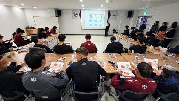 이날 강연자로 나선 일동후디스 식품연구소 팀장은 프로 선수들의 신체 특성과 활동량을 고려한 맞춤형 영양 솔루션을 제시했다. 세미나의 핵심 내용은 고강도 경기 후 빠른 근육 회복을 위한 아미노산 활용법, 포지션별 특성에 맞춘 에너지 대사 및 단백질 섭취 최적화 전략, 그리고 경기 전후 실전에서 즉각 적용할 수 있는 아미노산 섭취 루틴 등 선수들이 실제로 활용 가능한 맞춤형 영양 설계 가이드로 구성됐다.