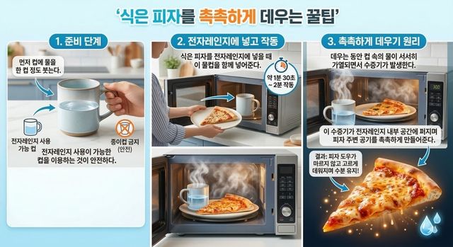 [인포그래픽] 기사를 바탕으로 AI가 생성한 인포그래픽 이미지. 전자레인지에 식은 피자를 넣고 데울 때 물컵을 함께 넣어주면 더 촉촉한 식감으로 먹을 수 있다.