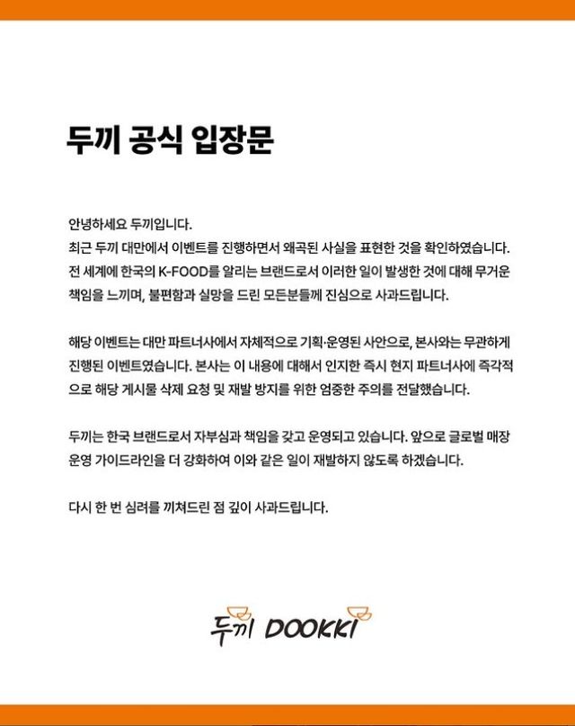 이에 한국 두끼 본사 측이 입장문을 내놨다. 12일 두끼 본사는 공식 SNS를 통해 "전 세계에 한국의 K-푸드를 알리는 브랜드로서 이러한 일이 발생한 것에 대해 무거운 책임을 느끼며, 불편함과 실망을 드린 모든분들께 진심으로 사과드린다"라며 "해당 이벤트는 대만 파트너사에서 자체적으로 기획·운영된 사안으로, 본사와는 무관하게 진행된 이벤트였다"라고 선을 그었다.