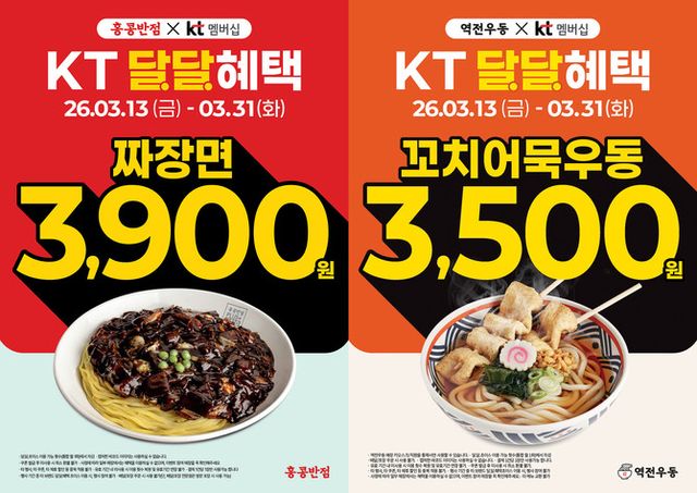 이번 행사는 KT멤버십 고객을 대상으로 이날부터 오는 31일까지 진행된다. 행사 기간 동안 홍콩반점의 짜장면은 3900원, 역전우동의 꼬치어묵우동은 3500원에 이용할 수 있다.