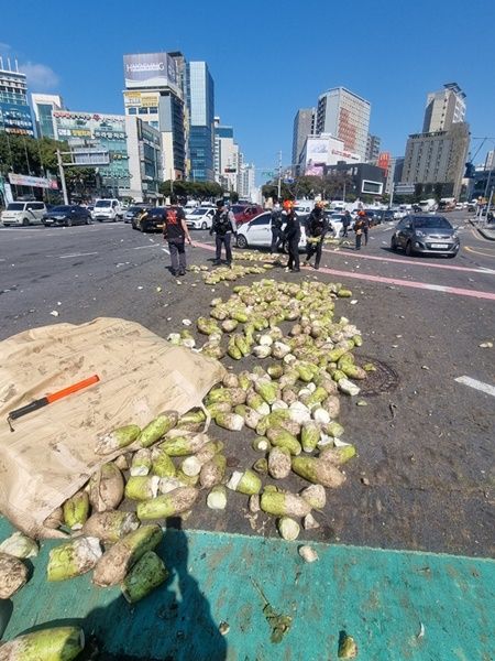 월동무가 쏟아진 제주시 노형오거리 일대 도로. 제주경찰청 제공