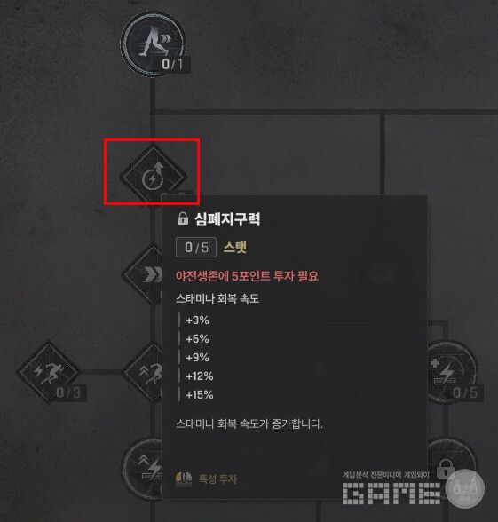 첫 5포인트는 야전생존에 몰아넣는다. 뒷걸음질 1포인트, 효율적인 달리기 3포인트를 찍으면 야전생존 누적 4포인트다. 여기서 1포인트를 추가로 야전생존에 투자하면 누적 5포인트가 되어 심폐지구력과 호흡하기가 해금된다.