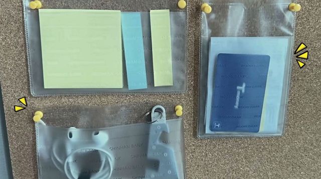 이어폰이나 충전 케이블처럼 책상 위에서 자주 사라지는 소형 전자기기 액세서리를 넣어두는 용도로도 활용된다. 투명한 비닐 덕분에 내용물을 바로 확인할 수 있다는 점도 장점이다. 흔한 은행 통장 비닐이 책상 주변 정리용 월 포켓으로 바뀌는 셈이다.