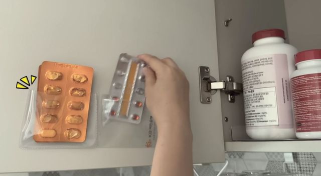 주방 수납장이나 싱크대 문 안쪽 공간도 통장 비닐을 활용하기 좋은 위치다. '양면 실리콘 테이프' 등을 이용해 문 안쪽 평평한 면에 부착하면 약이나 영양제를 보관하는 작은 포켓으로 사용할 수 있다.
