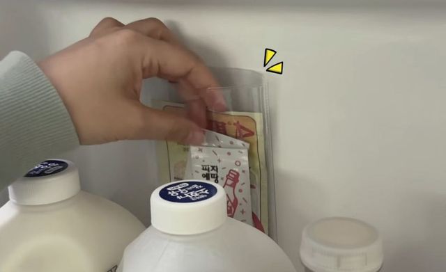 이 경우에도 실리콘 양면 테이프 등을 이용해 통장 비닐을 냉장고 벽면에 부착하면 작은 소스팩을 세워 보관할 수 있는 공간이 만들어진다. '양면 실리콘 테이프'를 사용하면 냉장고 내부 벽면에 비교적 안정적으로 부착할 수 있으며 떼어낼 때 자국이 남지 않는 경우가 많다.