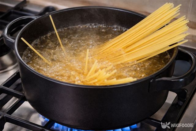 냄비에 물을 넉넉히 붓고 끓인다. 물이 팔팔 끓으면 소금 1큰술을 넣는다. 스파게티 면을 넣고 약 8분 동안 삶는다. 나중에 팬에서 한 번 더 볶아야 하므로 면이 너무 퍼지지 않도록 시간을 지키는 것이 좋다.