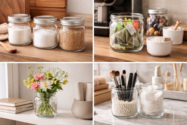 길이가 긴 메이크업 브러시, 아이라이너, 마스카라 등을 꽂아두면 흩어지기 쉬운 도구들을 한눈에 파악할 수 있다. 병 바닥에 작은 진주 구슬이나 커피 원두를 채우면 브러시가 쓰러지지 않게 고정할 수 있다. 또한 먼지가 쌓이기 쉬운 화장솜이나 면봉을 투명한 향초 공병에 담아두면 위생적이면서도 깔끔한 수납이 가능하다.