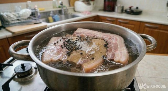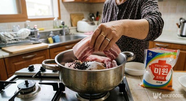 먼저 냄비에 삼겹살, 통후추, 소금, 설탕, 미원을 모두 넣고 고기가 완전히 잠기도록 물을 붓는다. 처음부터 약불로 맞추고 시작한다. 인덕션 기준 3~4단이면 적당하다. 팔팔 끓이지 않고 뭉근하게 1시간 삶는 것이 야들야들한 식감의 비결이다.