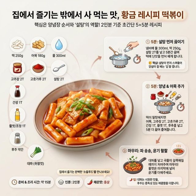 복잡한 조리 도구나 값비싼 비법 소스 없이도 집에서 사 먹는 떡볶이 맛을 완벽하게 재현할 수 있는 방법이 있다. 핵심은 양념장을 넣는 순서와 '설탕'의 역할에 있다.