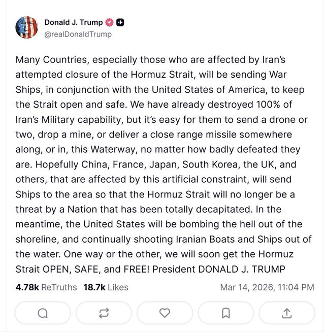 트럼프 대통령은 14일(현지시각) 트루스소셜에 올린 글에서 "이란의 호르무즈 해협 봉쇄 시도로 영향을 받는 국가들이 미국과 협력해 해협을 개방되고 안전하게 유지하기 위해 군함을 파견할 것"이라고 밝혔다. 이어 "바라건대 중국, 프랑스, 일본, 한국, 영국, 그리고 이 인위적인 제약의 영향을 받는 다른 나라들도 해당 지역에 군함을 보내 지도부가 완전히 제거된 국가로 인해 호르무즈 해협이 더는 위협받지 않도록 해주길 바란다"고 했다.