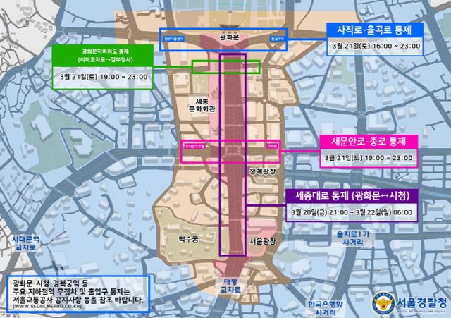 사직로와 율곡로는 적선교차로에서 동십자교차로 구간까지 행사당일인 21일 오후 4시부터 11시까지 통제되고, 새문안로와 종로의 경우 포시즌스 호텔 앞에서 서린교차로 구간이 21일 오후 7시부터 11시까지 통제된다.