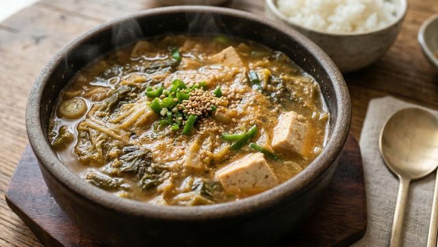 여기에 미리 양념해둔 우거지 1kg을 넣고 다시 10분간 더 끓인다. 우거지가 국물과 어우러져 충분히 부드러워졌을 때 마지막으로 간을 맞춘다. 이때 맛소금을 아주 살짝 추가하면 좋다. 된장만으로는 채워지지 않는 감칠맛을 끌어올려 주기 때문이다. 마지막으로 어슷하게 썬 대파와 두부를 넣고 1분만 더 끓여내면 버릴 뻔했던 배추잎의 화려한 변신이 끝난다.