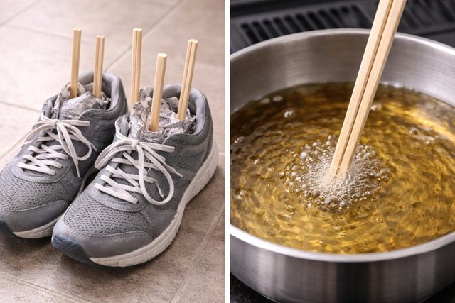 장마철이나 눈이 오는 날 젖은 신발을 관리하는 데 있어 나무젓가락은 훌륭한 건조 보조제로 기능한다. 젖은 운동화 내부에 신문지를 뭉쳐 넣는 방식은 일반적이나, 여기에 나무젓가락을 대각선이나 수직으로 세워 넣으면 건조를 더 쉽게 할 수 있다. 나무젓가락이 신발 내부의 공간을 확보하여 공기가 흐를 수 있는 통로를 만들어주기 때문이다. 또한, 나무 알갱이 사이의 미세한 기공들이 내부 습기를 빨아들여 머금는 천연 제습제 역할을 수행함으로써, 불쾌한 냄새의 원인이 되는 세균 번식을 억제하고 건조 시간을 단축시킨다.