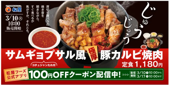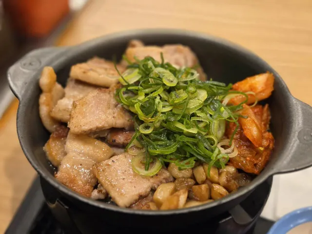 작은 철판에 삼겹살이랑 마늘, 김치 올라가고 밥이랑 된장국 기본에 샐러드 같이 있는 메뉴도 있음.