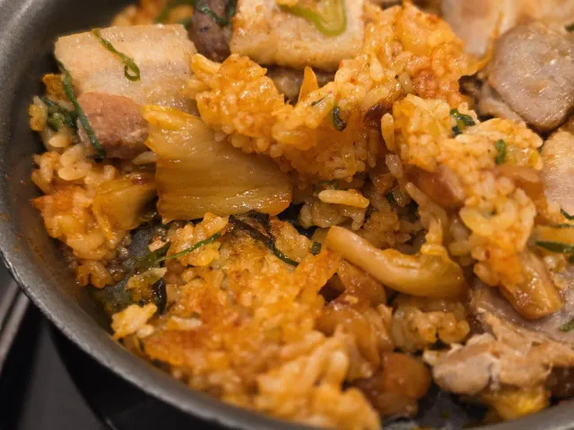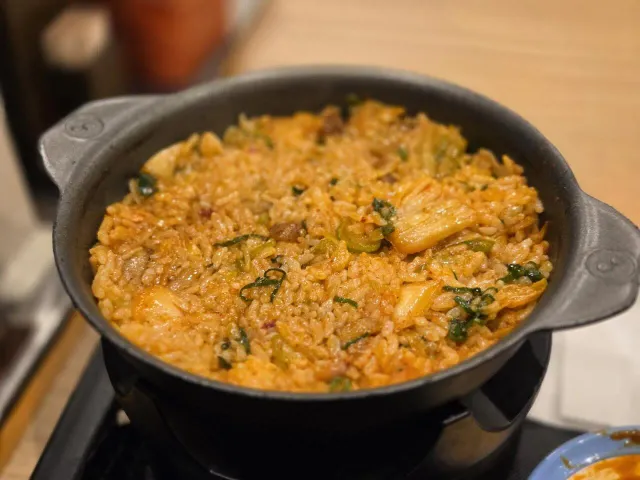 이거 아래에 고체 연료 들어가 있어서 돼지기름에 김치랑 마늘 구워지고 있음.