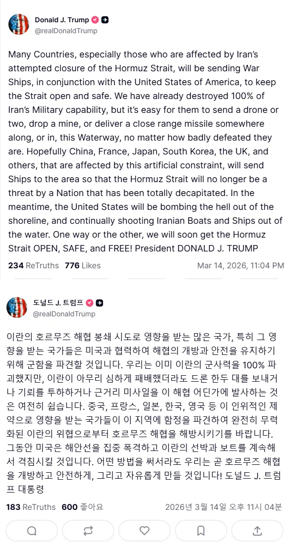 중국,프랑스,일본,한국,영국은 호르무즈 해협에 함정을 파견하여 해방하는걸 도와라.
