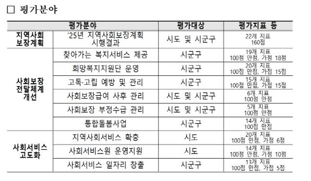 복지부는 시·도와 시·군·구를 대상으로 2026년 지역복지사업 평가를 실시한다고 15일 밝혔다. 평가 대상은 총 10개 분야다.