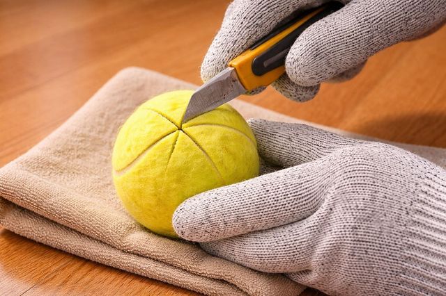 의자나 테이블 발커버를 만들기 위해 테니스공을 칼로 자르는 모습. 다치지 않게 안전에 유의해야 한다. 기사 이해를 돕기 위해 AI를 활용해 제작한 자료 사진입니다. 실제 모습과 다소 차이가 있을 수 있습니다.