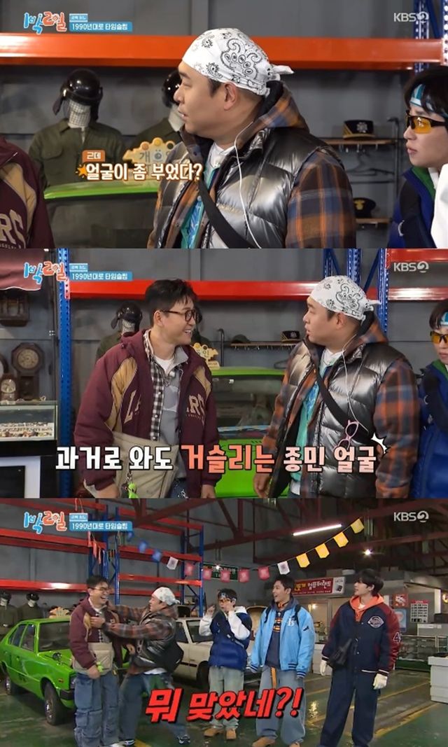 이날 문세윤은 안경을 쓰고 온 김종민의 얼굴을 보더니 "부었네. 뭐 맞았네"라고 얘기했다.